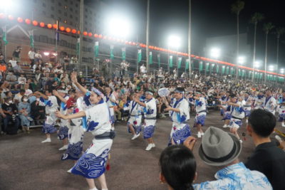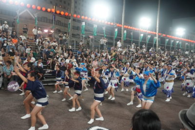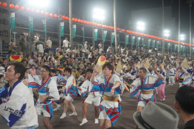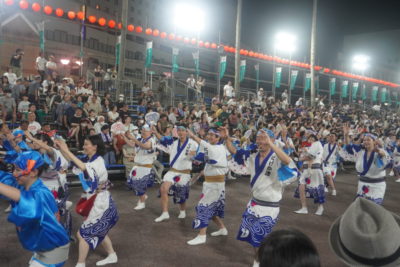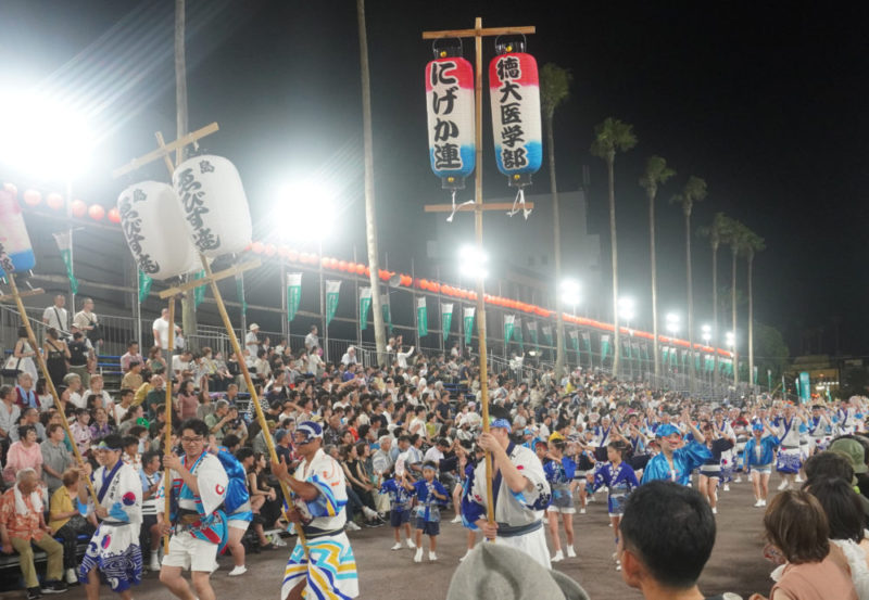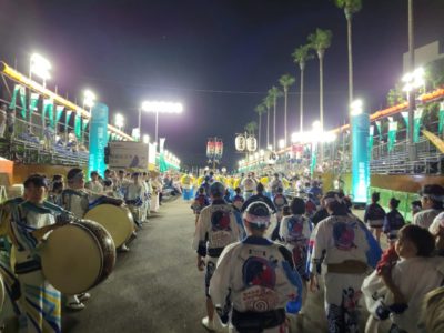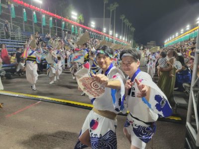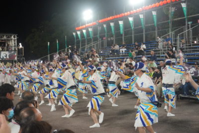 21時42分に藍場浜演舞場へ踊り込みました。今回から演舞場最後のところにVIP席が設けられていました。桟敷席には大勢の観客がいて、緊張しかありませんでした。ゑびす連に誘導され、いざ本番!最初は緊張が強かったですが、途中から楽しまないと思い、渾身の力で掛け声を上げました。「ヤットサー、ヤットヤット!」、「踊りはぁ~?」「にげか連!!」、「踊りはぁ~?」「ゑびす連!!」っと、叫び続けました。みんなも負けじと掛け声と踊りを上手にこなしていました。学外講師の先生方も一緒に、演舞場での阿波踊りを楽しんでいただきました。演舞場での踊りは一瞬の出来事でしたが、本当に楽しかったです。終わった後はまだ踊り足りない気持ちでしたが、にげか連阿波踊り2023は幕を閉じました。